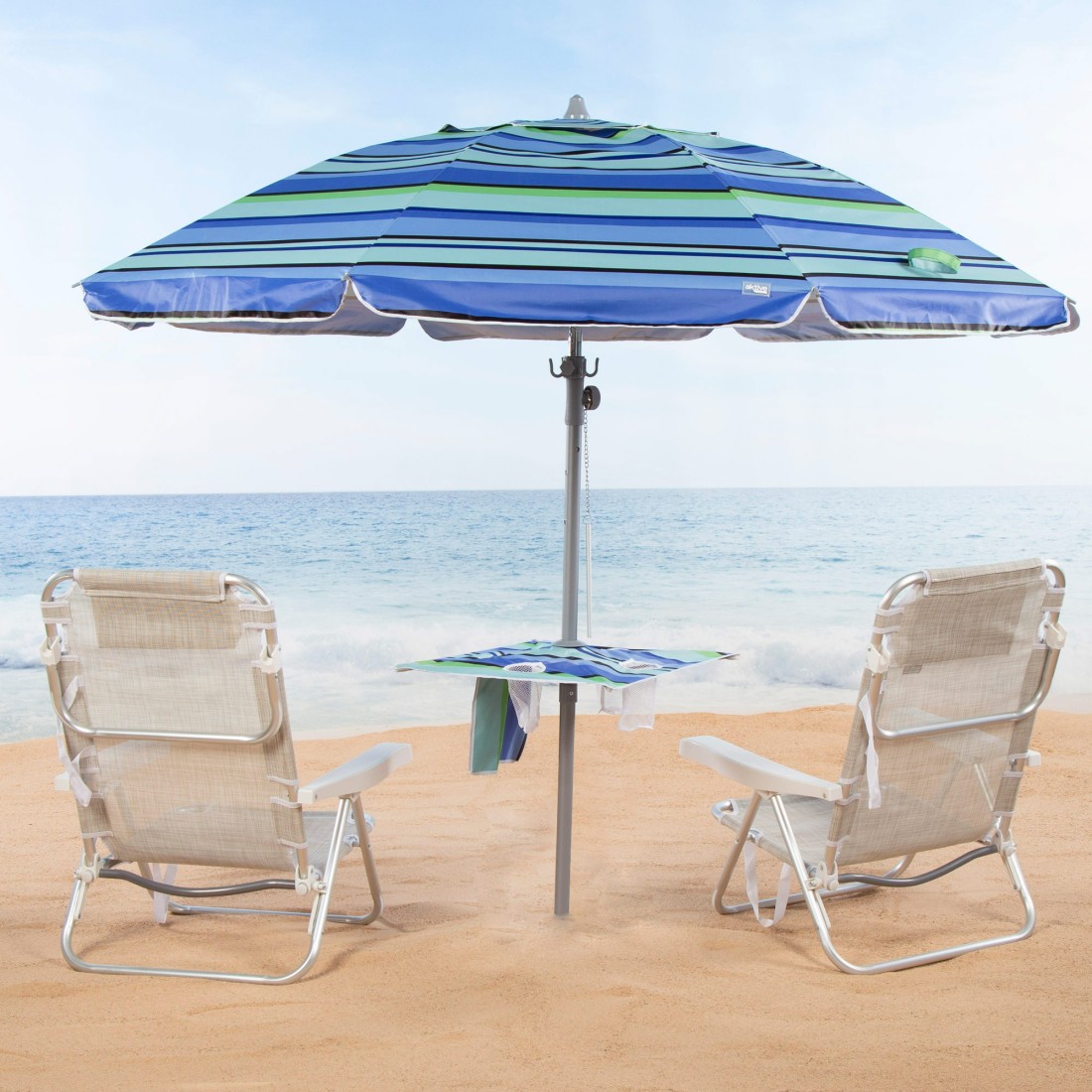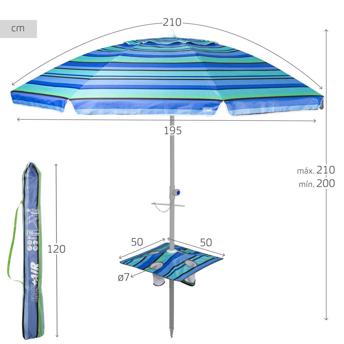 Sombrilla playa antiviento 210 cm rayas azules con pared y mesa